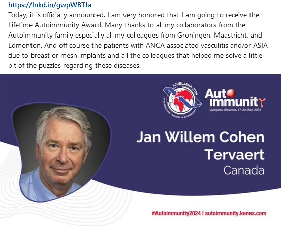 Professor Dr. Jan Willem Cohen Tervaert heeft te horen gekregen dat hij in mei van dit jaar een bijzondere prijs gaat ontvangen, namelijk de Lifetime Autoimmunity Award. De uitreiking van deze prestigieuze prijs zal plaatsvinden tijdens het Autoimmunity Congress 2024 in Ljubljana.